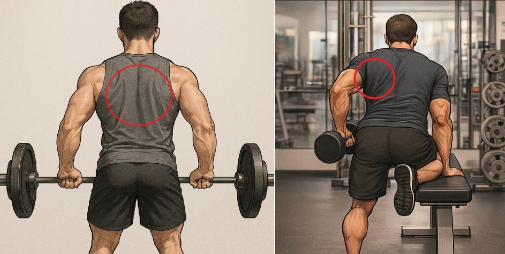 一方、ワンハンドロウは肘を外側に張ったり、引く角度を少し外に広げたりできるので、広背筋の外側、いわゆる「逆三角形のライン」を強調しやすいのが特徴です。