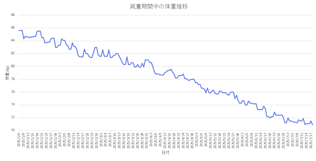 実際に記録していた体重推移データを以下にグラフとして紹介します。