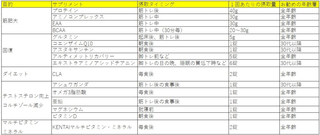 また、若いうちは筋肥大系のサプリを重視し、年齢を重ねたら疲労回復系を重視すると良いと思います。